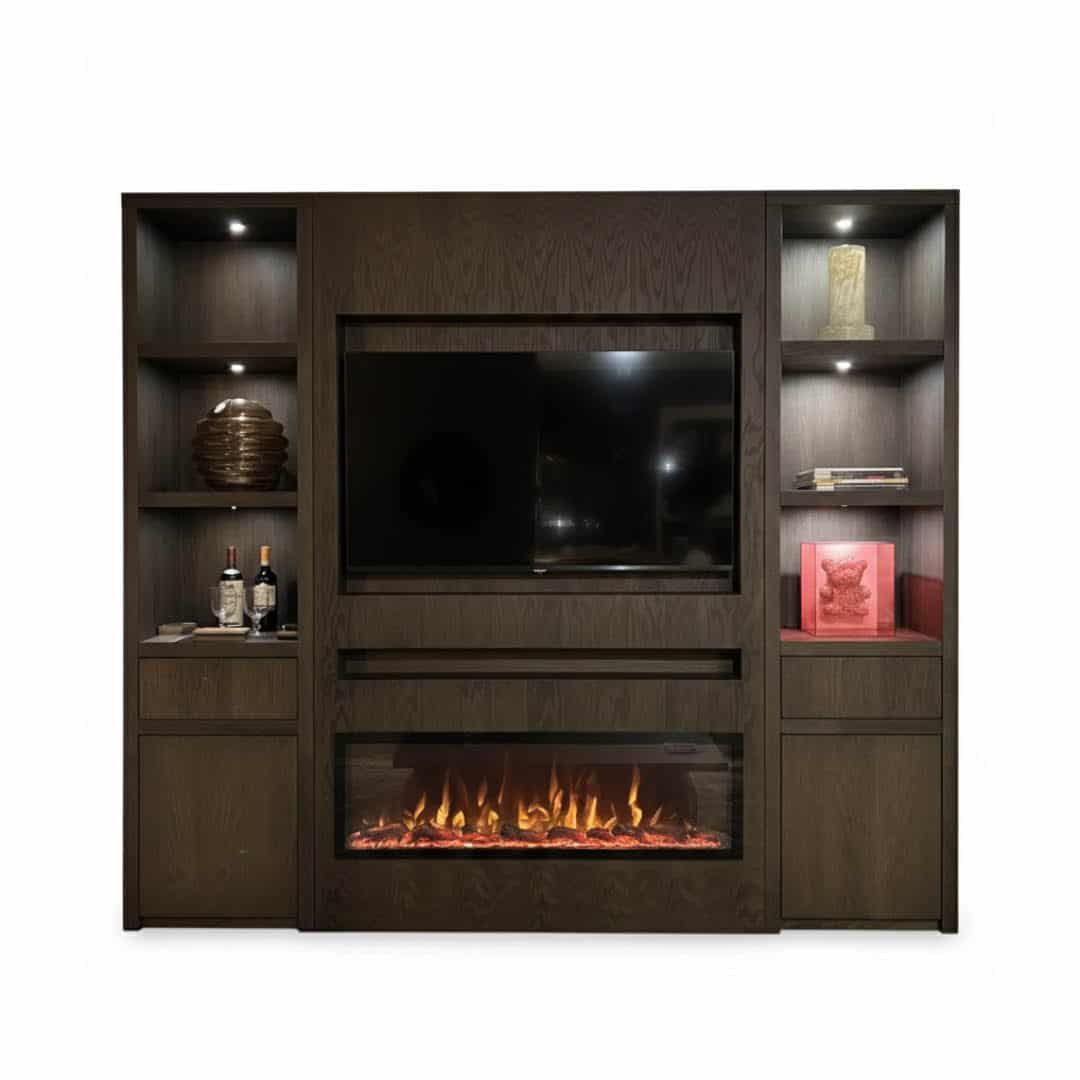 De inbouwhaard is optioneel en beschikbaar in verschillende uitvoeringen, net als de kast zelf, die leverbaar is in diverse kleuren en afwerkingen. Zo creëert u een unieke wandoplossing die past bij uw smaak én uw woning.